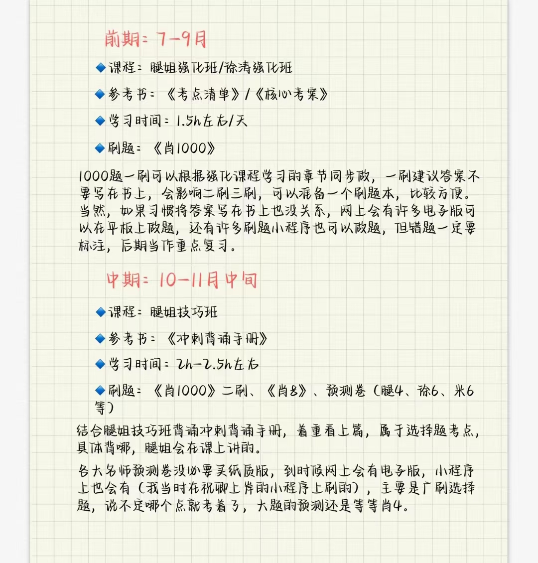 对于知识点,第一遍框架记忆、第二遍填充知识点、第三遍前后系联、第四遍背诵重点。因为前期的工作做得比较完整,笔记也是根据我自己情况整理的,所以背起来吸收特别快。