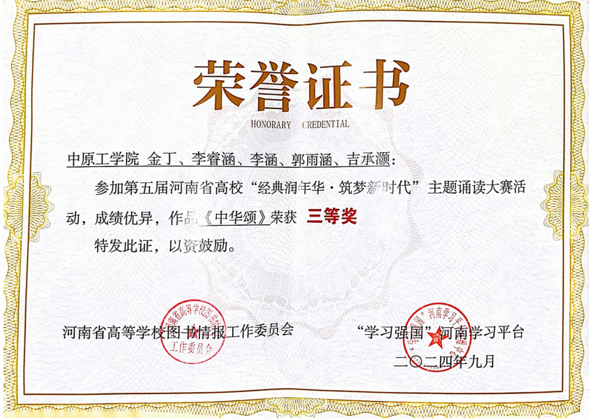 近日,第五届河南省高校“经典润年华·筑梦新时代”主题诵读大赛结果出炉,新葡官网汉语国际教育专业金丁、李睿涵、李涵、郭雨涵、吉承灏录制的朗诵作品《中华颂》荣获本科生组三等奖。