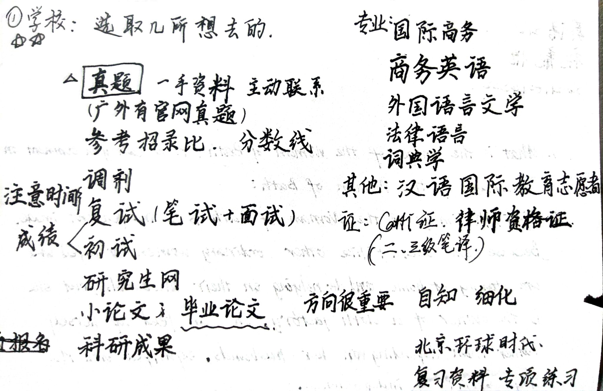 专业课:暑假,背单词、做阅读、听网课补充翻译基础;9-10月,背单词、读外刊、进行专项练习,包括翻译、阅读、完型等;冲刺期则进行真题模拟和作文素材积累。最后还是遗憾做题速度没有提上去,翻写这门课也没能写完(真的是惨痛的教训“不要追求完美,只求完整”)一定要根据分值和个人情况来规划复习时间(两门专业课备考的不是特别充分,我也早有心理准备,因为本身不擅长,付出的努力也不够,所以我只能分享一下备考资料,其他的参考价值不大)。