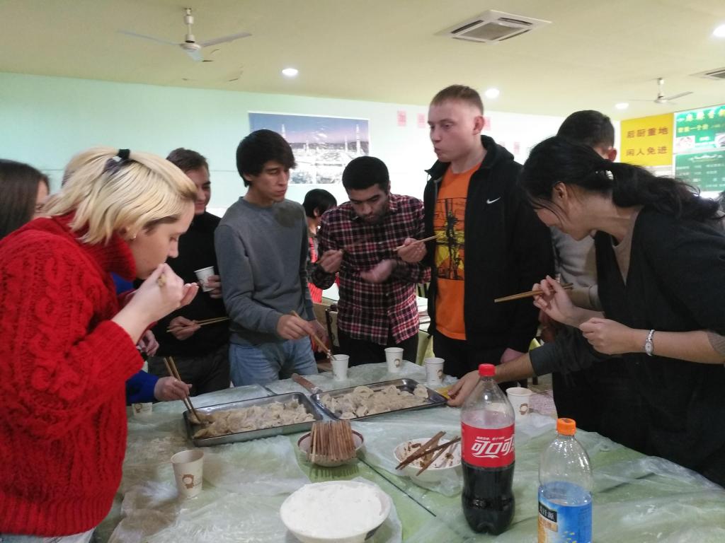 在冬至来临之际,为让留学生们进一步体验中国传统文化,丰富课余生活,促进国际文化交流,新葡官网于2017年12月22日中午11:30-13:30在南苑三楼清真餐厅举行了3003新葡官方网站庆冬至包饺子活动。此次活动由汉语系老师彭琰老师组织,汉语系的朱洁老师、孙西瑾老师、郭浩杰、陈维强同学,英语系的朱莎莎,张晓琳同学及9名留学生共同参与其中。