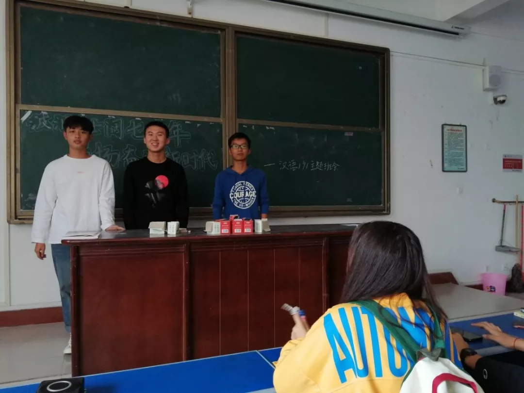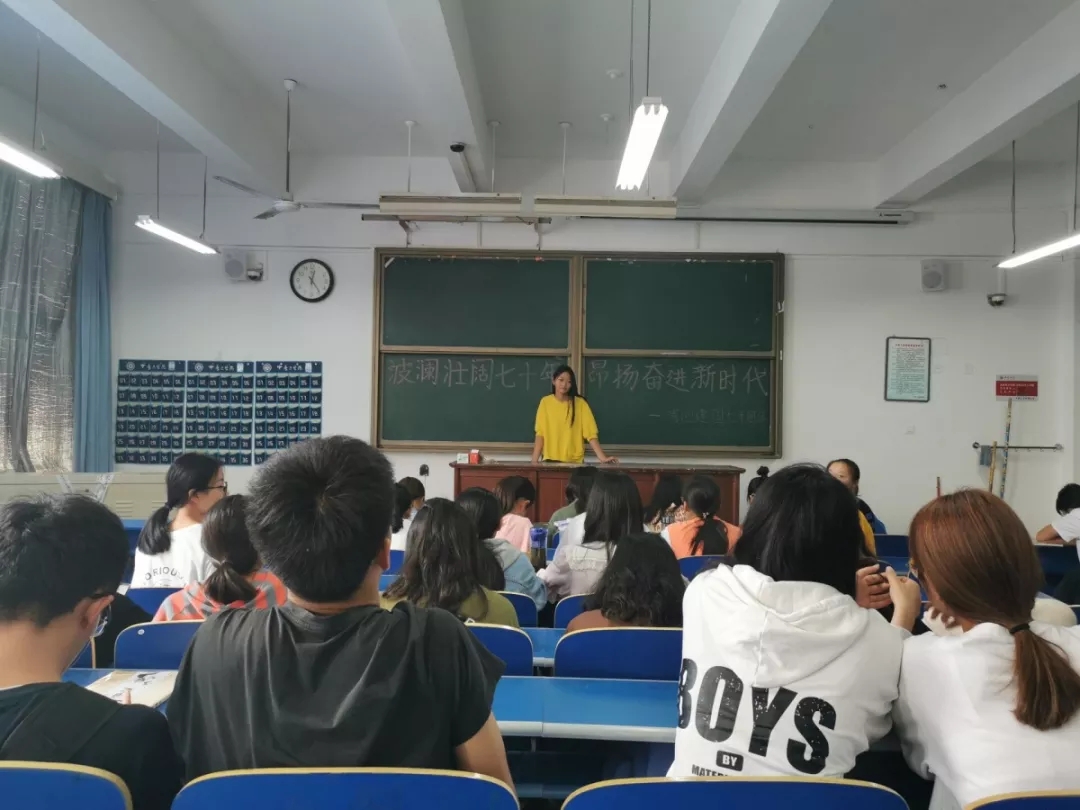我们的活动主体以班会的形式进行。在班长的带领下,我们了解了孔繁森、王继才夫妇、其美多吉等优秀先进人物。他们都是凝聚中国精神、中国力量的体现。我们倍受鼓舞,也在心中埋下一个希望与力量的种子。在会议期间,同学们就祖国70年的历史进程展开了热烈的讨论,大家都讲起了心中的英雄,也为这次活动更添了一份激情。之后陈若飞同学的发言也是讲出了大家的心声,一时掌声频起。今天也留下了我们班级的第一次大合照,大家脸上的笑容不再似初见是的腼腆,有的都是发自内心的欢欣以及对祖国日益强大的自信。