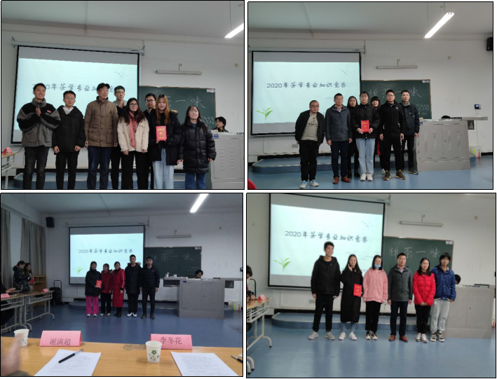 此次竞赛共有六支参赛队伍:四季茗缘队、灵悟队、“糖”克糖队、翎宸队、“我说的都对”队和六神五组队。竞赛内容涉及茶文化、茶叶生物化学、茶艺、茶树栽培学、茶树病虫防治害防治等多个方面;竞赛环节分必答环节、抢答环节、选答环节(风险题)和小组自我主题展示环节四部分。必答题环节各小组轮流作答;抢答环节共有15道,队员按要求自由抢答,答对加3分,答错扣3分;选答环节选择相应的分值,并盲选一题作答,由参加活动老师对选手作答情况进行评判并打分;自我展示环节,小组成员对赛前所抽主题进行PPT视频汇报展示,由老师进行评判打分;竞赛最终成绩为四环节总成绩和。