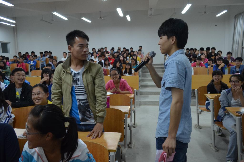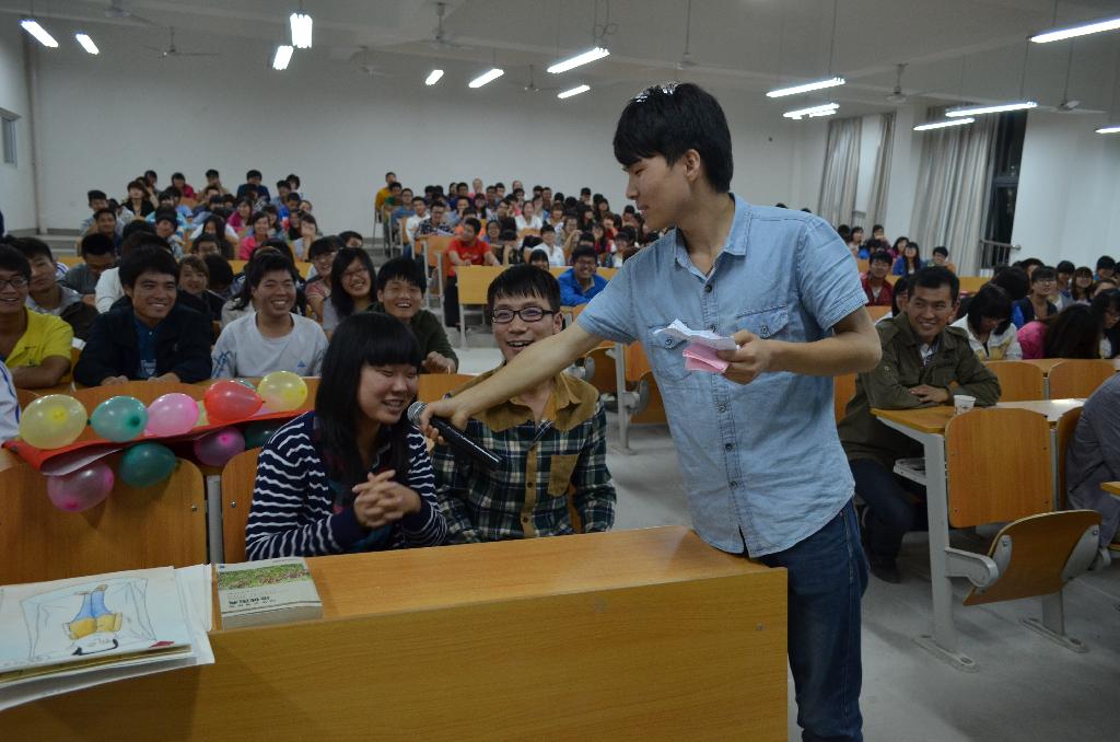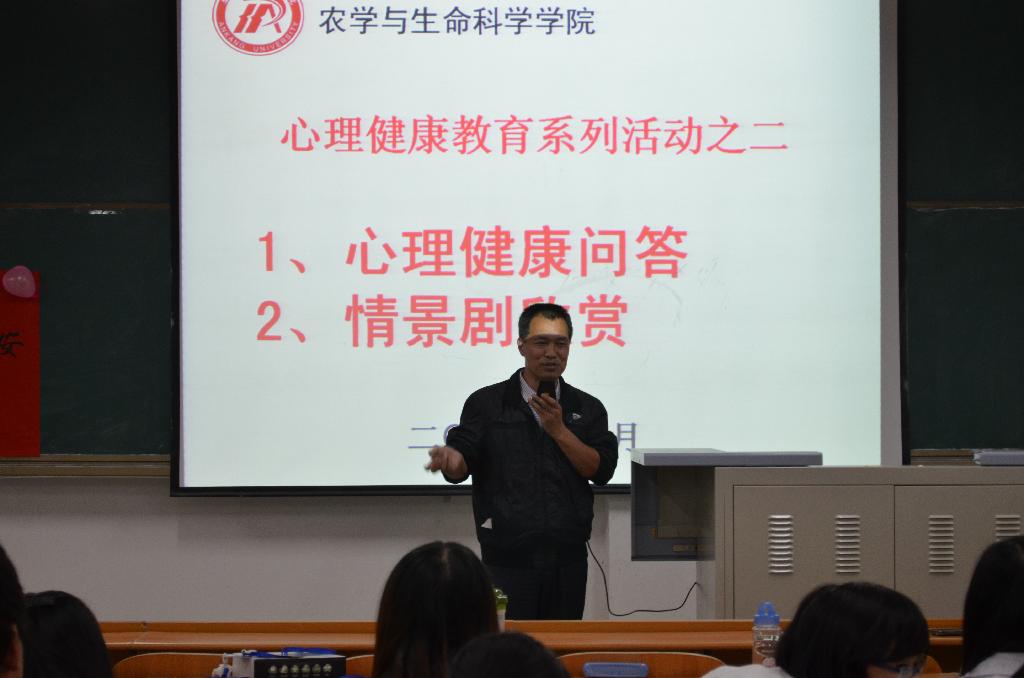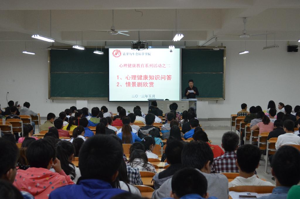 5月30日晚,best365官网在1301教室举行心理健康教育系列活动之二——心灵舞台,秀出真我。本次活动内容共分四个部分,心理健康知识问答、心理健康漫画作品赏析、心理情景剧《陌上转身》表演、复旦投毒案警示片观看。经管系纪宏耀副教授,农生院学工办主任谭自力、辅导员金清民、团总支书记赵世锋及院团总支、学生分会全体学生干部,2012级全体同学共270人参加了活动。