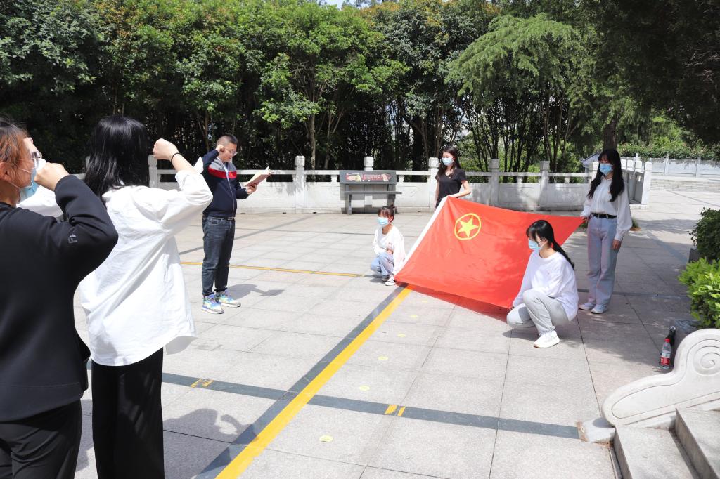 在烈士陵园,团员青年高唱《义勇军进行曲》,国歌唱毕,全场肃立,向革命烈士默哀致敬,学生代表向烈士纪念碑敬献花篮,表达深切哀思。面对鲜红的团旗,团总支书记张伟艺带领全体团员重温入团誓词,并讲授《英雄烈士谱·廖乾武》党史微团课,介绍廖乾武同志先进事迹,并号召团员青年注重和弘扬先烈精神,切实在真敬真信中坚定信念,在学思践悟中牢记使命。祭奠仪式后,全体团员聆听工作人员讲解烈士们为国家革命、建设、改革而献身的光荣事迹,先烈们英勇不屈的革命精神深深打动着在场的每一位同志。