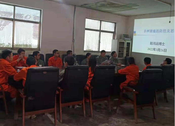 随后,围绕现场调研过程中发现的非洲猪瘟防控体系的风险与漏洞,赵博士对猪场技术员职级以上的技术人员进行了专题培训与现场研讨。针对一级隔离人员与场外环境存在接触、物资消毒不规范及病死猪转运过程中净污区交叉污染等问题,赵博士详细分析了其存在的风险并提出了相应的改进措施与建议。