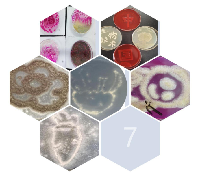 2020级生物技术班全员参与了本次微生物技能大赛,同学们从环境中自行筛选菌种,各小组经过精心设计,以培养皿做画板,以接种环作画笔,以微生物做“颜料”,耗费两周的时间,完成一幅幅精美的艺术作品。