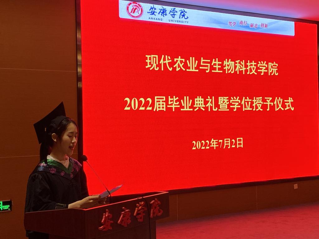 2018级茶学专业学生徐婷作为毕业生代表发言,分享了她在学校的成长经历和收获,她深情感恩母校的培养,号召毕业生在新的起点上心怀从零开始的勇气,永葆求知探索的初心,在未来的人生赛道中披荆斩棘,奋力奔跑,不负时代,不负韶华!