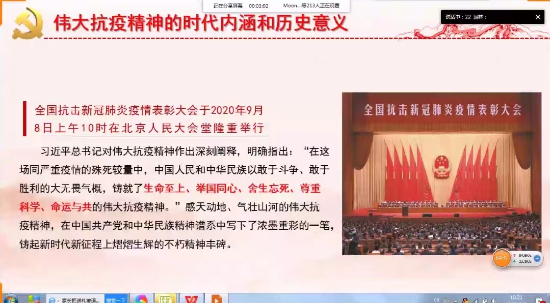 张伟艺结合习近平总书记在全国抗疫表彰大会上的重要讲话所蕴含的深刻内涵进行宣讲。他谈到,伟大抗疫精神是中国精神的生动诠释,在以习近平同志为核心的党中央坚强领导下,中国人民进行了艰苦卓绝的斗争,疫情防控阻击战取得了重大战略成果。抗疫斗争是一次大考,考出的是中国共产党的领导力,是中华民族的凝聚力,是中国人民的战斗力。