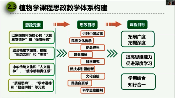 本次培训,教师们依次听取了西安交通大学周屈兰、湖南大学郑培、华中农业大学赵毓、延安大学曹殿波和东北大学丁义浩等五位老师的课程思政专题讲座。其中,周屈兰教授以西安交通大学为例,从组织架构和运行机制设计、人员的组织、发展定位和主要职责、建设内容、资源建设以及评价体系等方面系统地讲解了课程思政教学研究中心的建设与运行;郑培副教授结合自身高校课程思政教学比赛经历,从参赛课程思政元素的挖掘、如何有效准备课程思政教学竞赛和现场说课技巧与设计等三方面分享了参赛经验;赵毓教授根据自身教学实践阐述了课程思政融入专业课的必要性、课程思政是提升新时代人才培养的重要途径以及课程思政教学设计的策略与方法,并介绍了自己在《植物学》课程中的思政教学设计与实践;曹殿波副院长详细叙述了学科德育视角下的育人模式与方法、特色课程思政的教学原理与实施策略和课程思政教学设计模型,并以红色文化育人为案例作了进一步阐述;丁义浩副院长以课程思政资源挖掘与资源库建设为主题,从课程思政建设的实践困境、课程思政资源挖掘的基本方法和课程思政资源库建设等三方面作了报告。