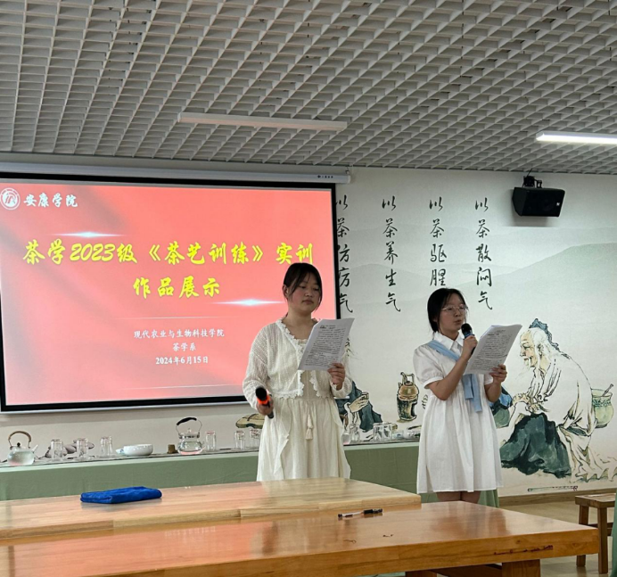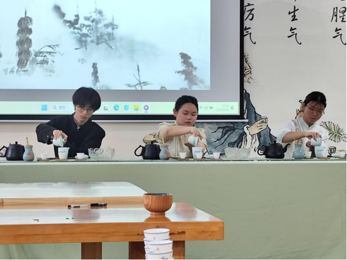 6月15日下午,茶学2023级《茶艺训练》课程成果展示在产教融合大楼茶艺室进行。茶学2023级全体同学参与展示,茶学系教师马瑛、袁月、尹旭超担任评委。活动由茶学22级学生田媛媛和夏雨主持。