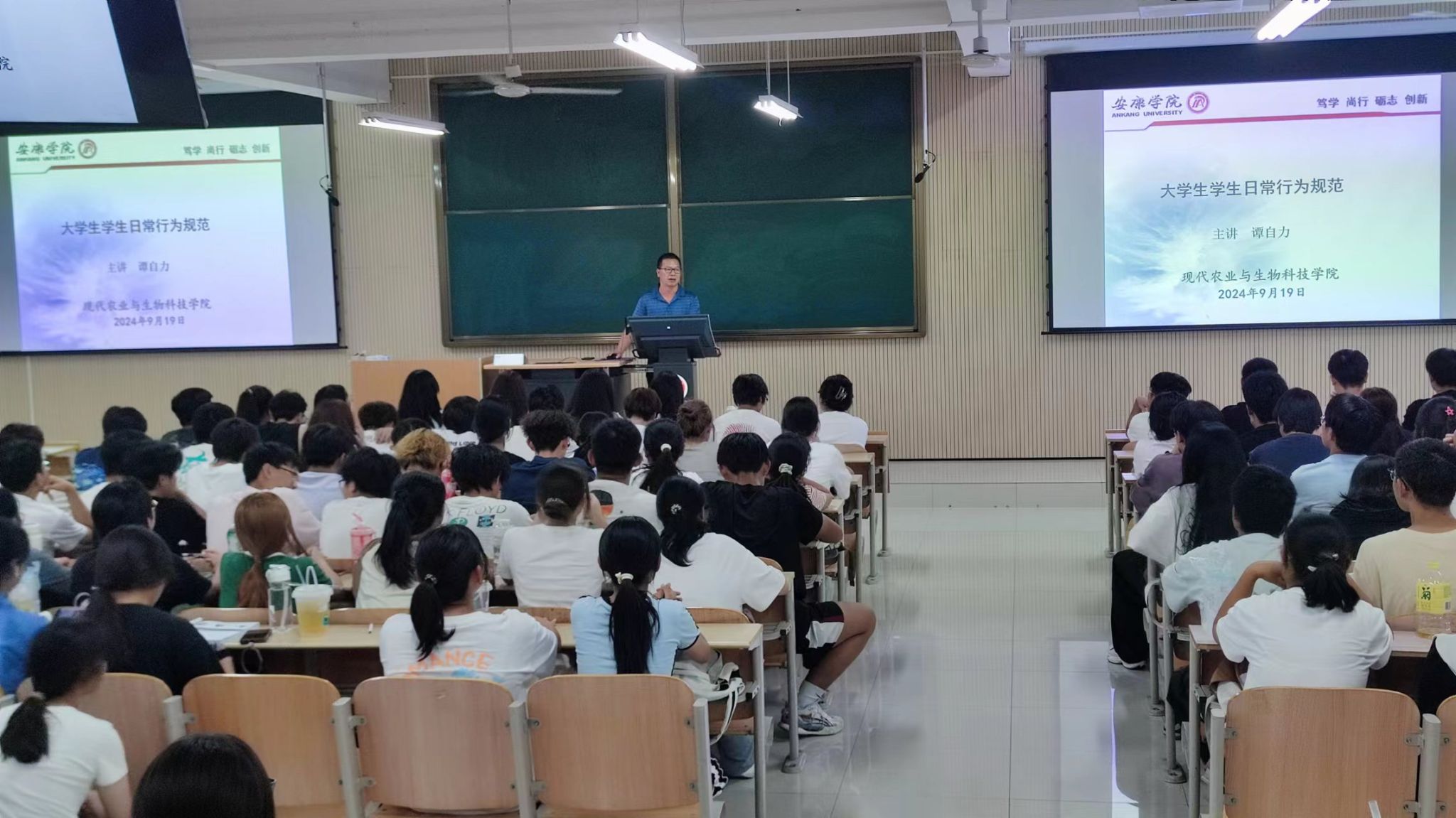 为加强新生入学后的组织纪律性教育,规范大学生日常行为,培养良好的生活、学习习惯,促进优良学风、校风建设。9月19日晚,best365中国官方网站在1301教室开展2024级新生日常行为规范教育主题讲座,学工办主任谭自力主讲。