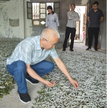 彭云武一行首先查看了春季地蚕饲养情况,在蚕病防治方面,建议蚕农投喂新鲜桑叶,及时使用石灰隔离病蚕,必要情况下可使用漂白粉淘洗桑叶,杀灭来自桑叶的病原,做好防虫防病工作。