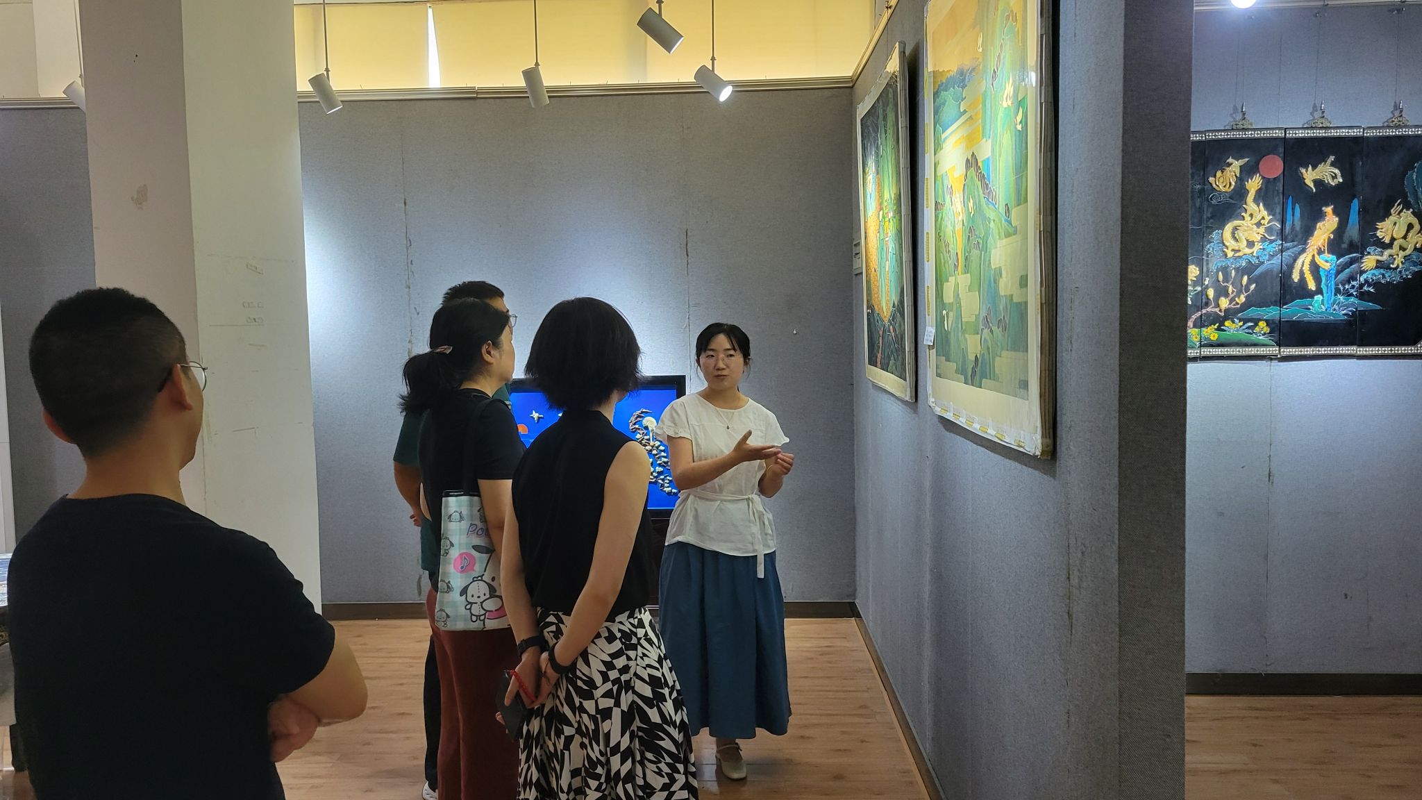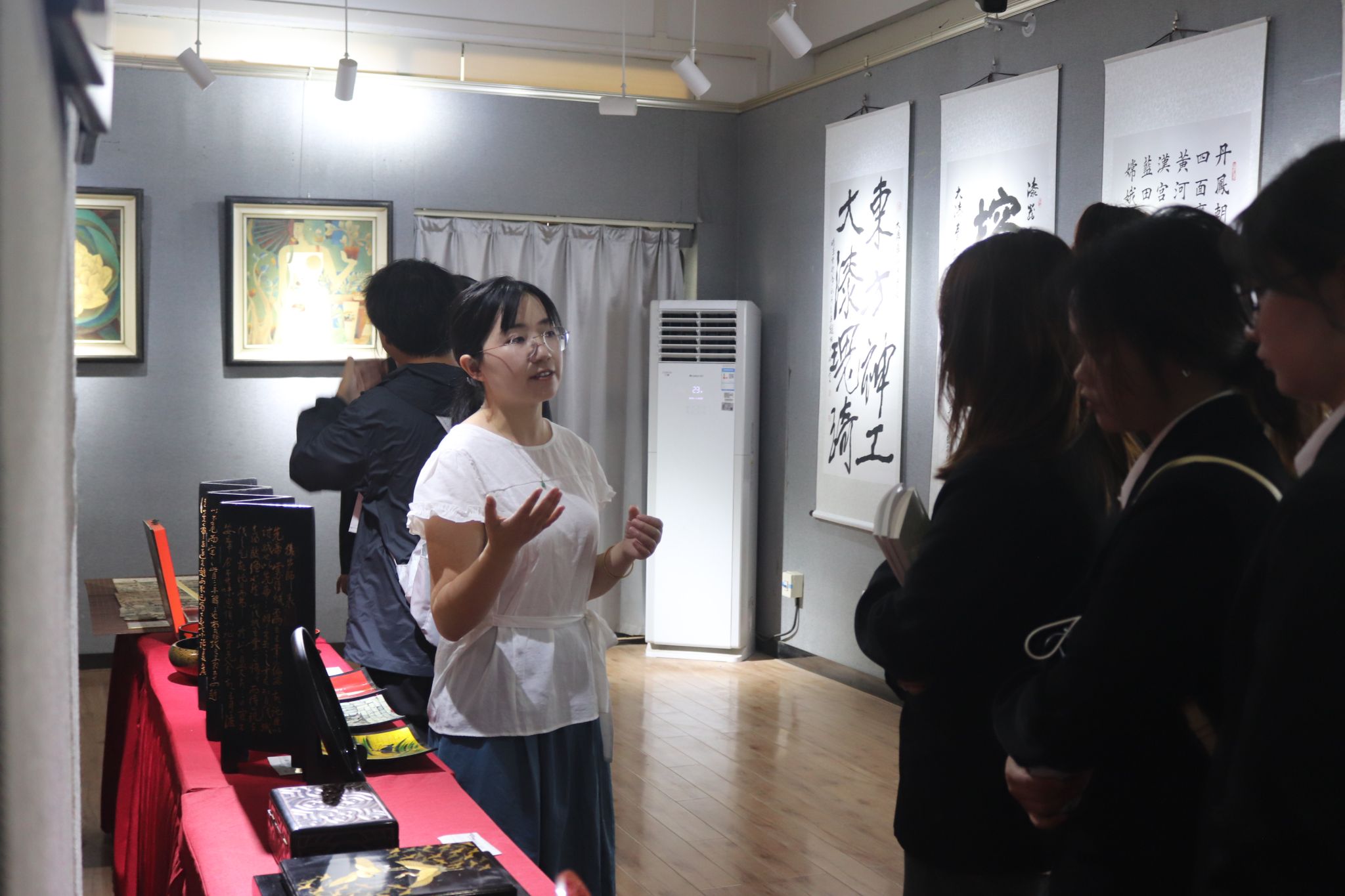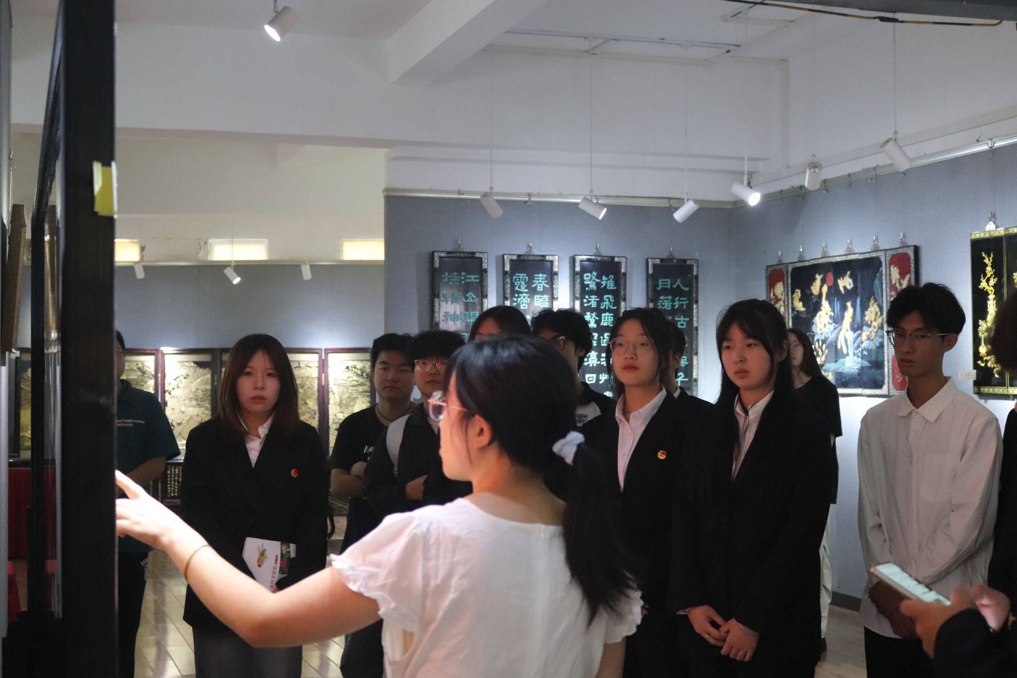 在讲解教师的引领下,best365官网师生系统了解了漆器从原料选取与处理、底漆涂刷、花纹描绘到成品打磨等关键制作环节,并针对不同工艺在质感和艺术表现上的差异作了深入阐述。师生分组驻足观摩,通过近距离鉴赏典型纹样和结构细节,进一步加深了对漆艺工艺流程的认识。