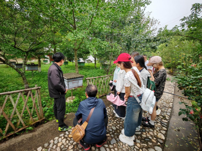 在村史馆,队员们透过讲解了解了村庄的自然风貌、人文历史与发展变迁,感受乡村奋斗历程;在产业展区,“三产融合”特色路径清晰呈现——文旅活动带动农产品销售,电商中心助力农产品外销;在合作社,队员实地察看生态大米、木耳、蜂蜜等农产品全产业链。在食用菌种植大棚中学习种植技术与市场前景。