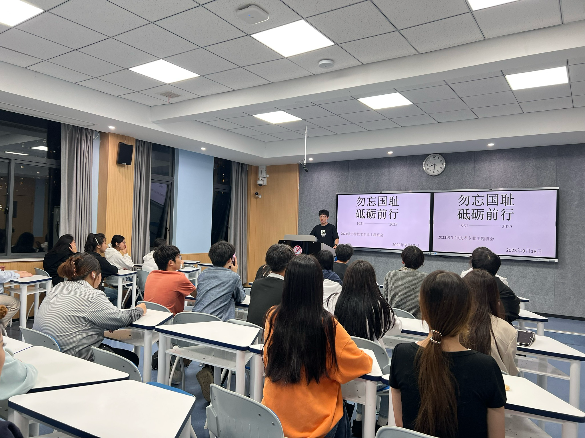 9月18日,2023级生物技术专业在江北校区1206教室开展了“九一八”事变94周年纪念活动。主题班会由班主任老师陈晓帅主持,全班同学参加。