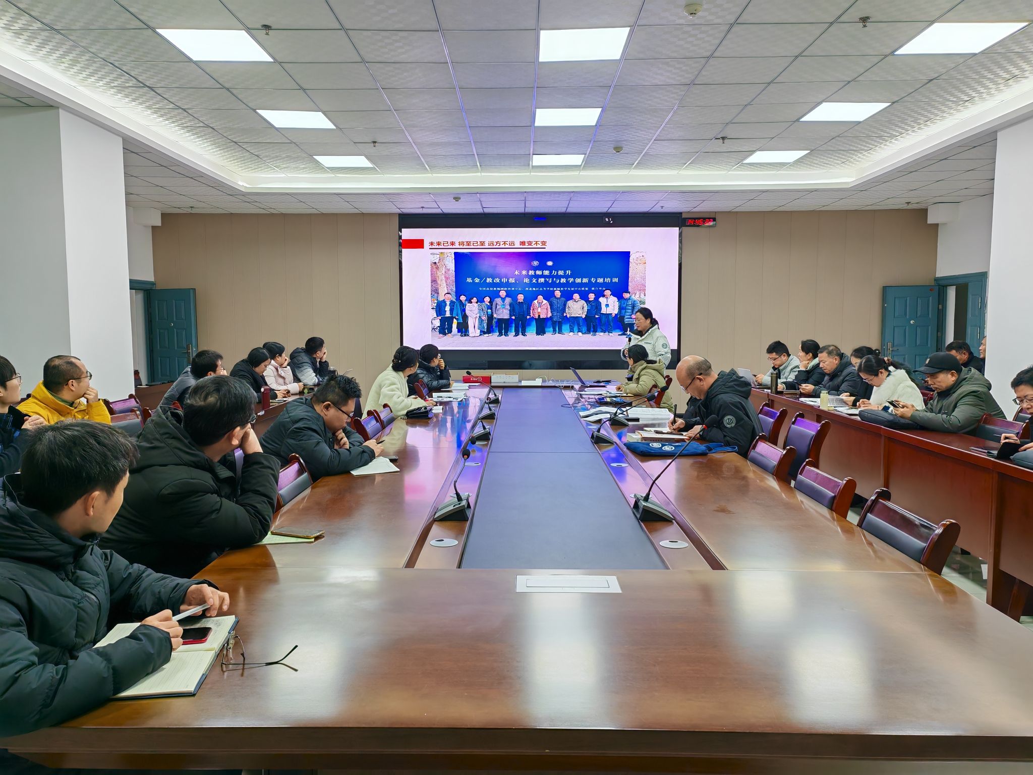 汇报会上,杨芳副院长以“未来教师能力提升培训汇报”为题,系统介绍了近日参加的高层次教学科研能力培训的核心内容,涵盖基金项目申报、教学成果凝练、智能教学技术应用、AI赋能科研写作等多个关键领域。