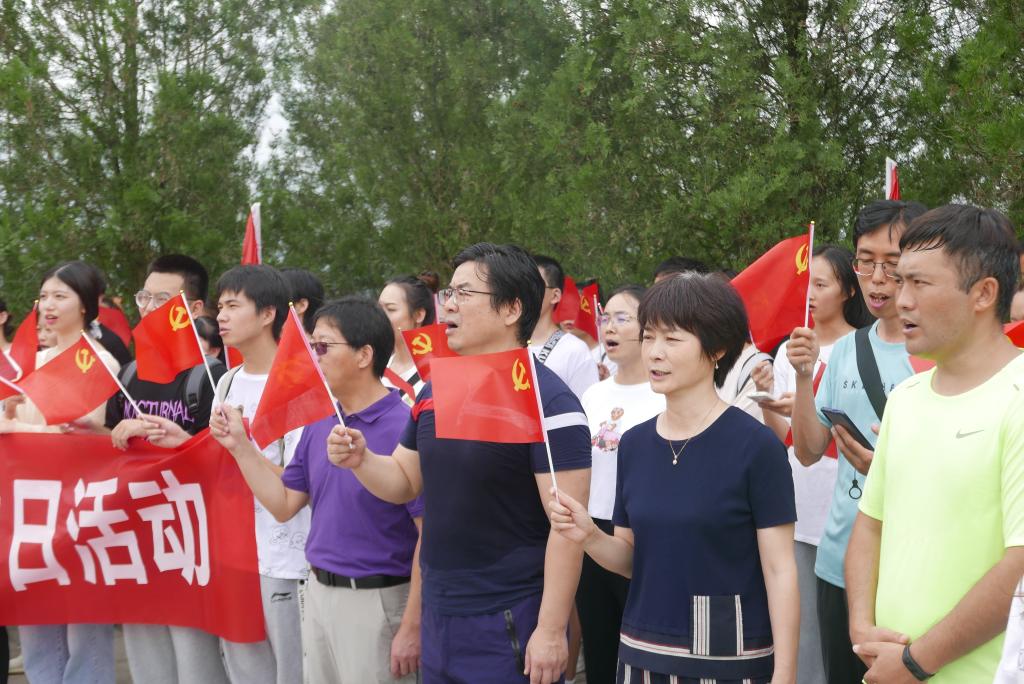 “五星红旗迎风飘扬, 胜利歌声多么响亮!歌唱我们亲爱的祖国, 从今走向繁荣富强!……”,全体师生挥舞着党旗,齐声合唱《歌唱祖国》,嘹亮的歌声唱出了对党和祖国的热爱,表达了对革命烈士的缅怀之情。