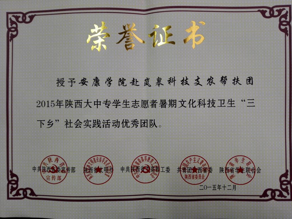 2015年12月团省委授予“赴岚皋科技支农帮扶团”社会实践活动优秀团队