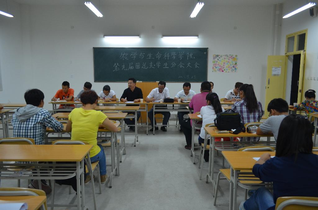 农学与生命科学学院于2013年9月25日在一号教学楼召开团总支、第九届学生分会成立大会。总支书记屈国胜、副院长陈立强、学工办主任谭自力以及辅导员金清民、吉昌群老师出席了本次大会。会议由谭自力主持。